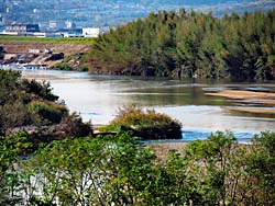 木津川の土手に上がると、木津川の雄大に流れています。下流を見ると木製の流れ橋とコンクリートの橋の新旧の橋を上下に見ることができました。土手にはお地蔵さんが祀られていました。