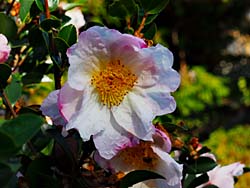 散歩道に咲いていた花です。お茶の花です。(写真左)、皇帝ダリアが青空をバックに紫色の花が冴えます。(写真中央)