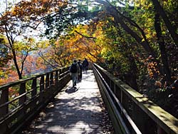 大阪府交野市にある「ほしだ園地」に行きました。全長200mほどの木製の歩道橋を歩きます。10m眼下には、流が流れています。