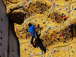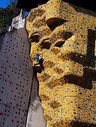 ほどなく、平成9年の「なみはや国体」の競技場になった、クライミングウォールがあります。高さ16.5m鉄骨造りガラス繊維補強セメントで作られています。利用料金は1日700円だそうです。写真右のような山道を歩いてメイン施設の吊り橋に向かいます。