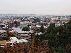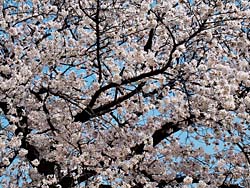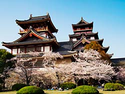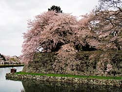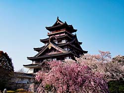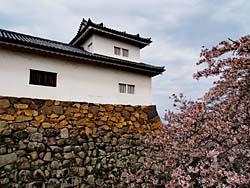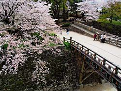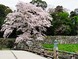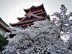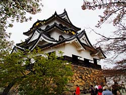 天守閣から見た光景です。(写真:左) そして城内の桜です。(写真:中央、右)思ったより数は少なく、城の周囲の堀端の桜の方がきれいに思えました。
