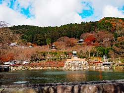 宇治川中の島に建つ「十三重の石塔」は高さ約15mで現存する日本最大・最古の石塔です。(写真中央) 弘安9年(1286)に宇治橋架け替えのときに供養塔として建立されました。その後、地震・洪水などで何度も倒壊、再建を繰り返しました。現在のは、明治41年(1908)に再建されたもので、頭部は破損のため使用されずに興聖寺の庭に移されました。(写真左) そして現在の頭部です。(写真右)