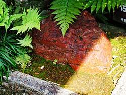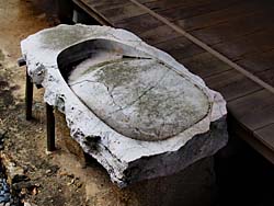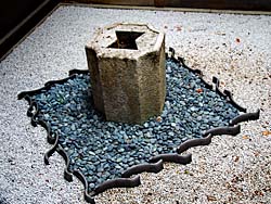 内玄関です。(写真左)坪庭(写真中央)、そして「つくばい」がありました。(写真右)