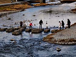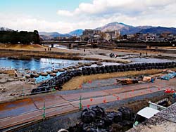 鴨川(左)と高野川(右)が合流する賀茂大橋から撮影。この寒い中、飛び石を渡る人達。賀茂大橋は、現在川を一部堰き止めて工事中でした。