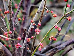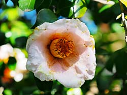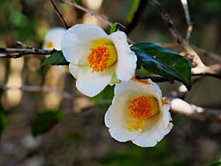 枝垂れ梅のほかに、ツバキが数多く咲いています。左から「曙(あけぼの)」、「有楽・太郎冠者(うらくたろうかじゃ)」、「蝦夷錦(えぞにしき)」です。