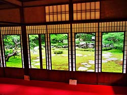 主屋の1階座敷から見た庭園です。2段の滝があり爽やかな音をたてていました。