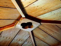 2月26日の続きです。主屋1階座敷の廊下の天井はです。明かりを取り入れる工夫がなされています。風呂ですが、その天井このようになっていて、その中心から水蒸気が拭けるようになっています。