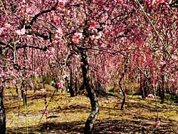 今回の主目的の「しだれ梅」です。春の山に150本咲いていました。(動 画) これだけの枝垂れ梅が咲くと圧巻です。