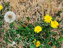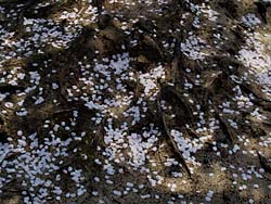 ヤマザクラの足下に、タンポポが落ちた花片と共に咲いていました。