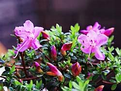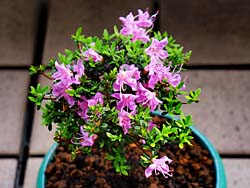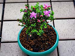 我が家で栽培している、鉢植えの「雲仙米ツツジ」というツツジが咲き始めました。その名のとおり花は直径1cm程の大きさで、薄紫色の可憐な花が咲いています。庭植えより盆栽に向いているツツジですね。