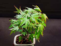 我が家で栽培している小品盆栽3点です。左から「楓」で、石づきで根が石を掴んでいます。「雲仙米ツツジ」で満開になりました。「山モミジ」で三幹の寄せ植えです。若葉の季節になりました。