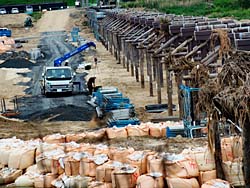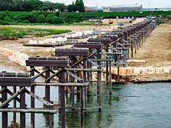 昨年の10月22日の大雨で、流れたままになっていた「上津屋橋(流れ橋)」の、復旧工事が始まっていました。過去22回も流れています。その傍でテントを立てて、バーベキューをしている家族が見られました。