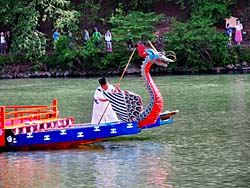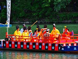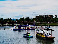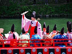 嵐山で行われた「三船祭」です。平安時代の船遊びを再現したもので、昭和3年から始まりました。舞扇を流しているのは、枕草子で名高い清少納言です。(動 画)
