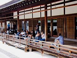 大きな硯?が庭にありました。案内板がなかったので何なのかよくわかりません。南禅寺垣と呼ばれている垣根です。独特の編み方がなされているのでしょう。方丈庭園に戻ってくると外国人観光客が、ズラリと並んで枯山水を見ていました。