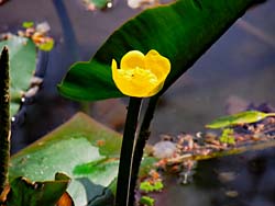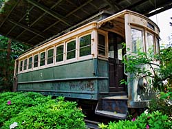 平安神宮です。神苑に入ると京都市電が展示されていました。日本最古の電車で、北野線を走っていたチンチン電車と呼ばれていた電車です。河骨が咲いていました。