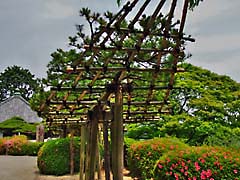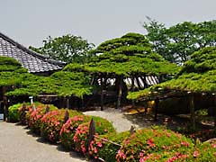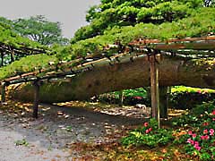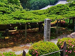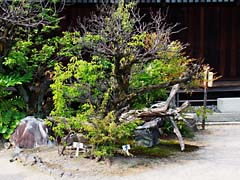 京都市山科区にある門跡寺院の「勧修寺」です。ハイビャクシンというヒノキ科の植物で樹齢は750年だそうでこのように小さな樹木ですが、枝が交わりあっています。(写真左) 「勧修寺型燈籠」と呼ばれている水戸光圀の寄進したものだそうです。(写真中央) 梅の木ですが、左側から孫、親、子と三代の木が伏した形で横たわっている珍しい梅の木です。(写真右)