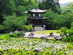 氷池園という庭園は、「氷室ノ池」を中心とした池泉舟遊式で「観音堂」が望まれます。(動 画)昭和6年の再建で「大斐閣」とも呼ばれています。池には、ハナショウブが彩りを添えていました。