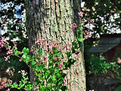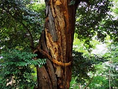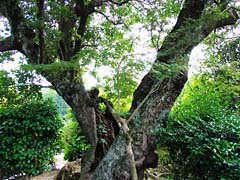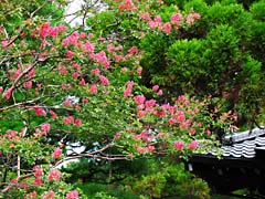 寺院の庭園には珍しい漆の木がありました。(写真左)沙羅双樹と云われているナツツバキが咲いていました。(写真中央)樹齢350年といわれる山桃の老木です。落雷によって二分されたとか。(写真右)