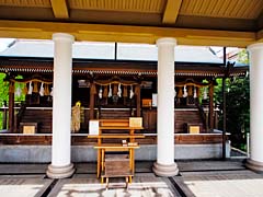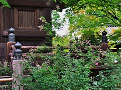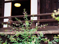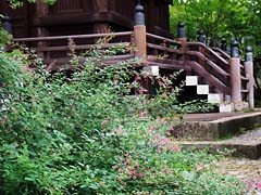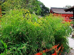 本殿の横に萩が咲いていました。清流が流れていて朱色の建物が望まれ、そよ風に萩が揺れているという風景が見ることができました。