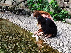 再び下鴨神社に戻って、貴船神社と同じの水占いがあります。君が代で歌われている「さざれ石」が岩となったものがありました。下鴨神社の「糺の森」は12万4千平方メートルあり、本殿までこのような直線の道が続いています。