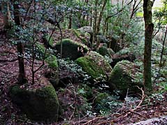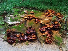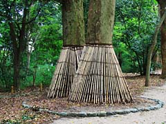 参道両側の樹木を見ると、根元を竹で囲まれている木がありました。根元を踏まれないようにするため?注連縄が巻かれた木もありましたが、その理由が不明です。切り株にキノコが無数に発生していました。