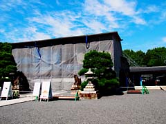 京都市伏見区にある「城南宮」です。鳥羽・伏見の戦いが始まった、ところとしても名高いところです。本殿は工事中でした。神苑にはいりました。入ると紫式部が咲いていました。
