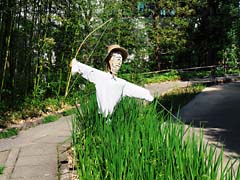 少し歩くと案山子がありました。平安の庭なのですから案山子も、その時代の姿にしたほうがよかったと思います。女郎花(オミナエシ)が黄色い花を付けていました。そして、ススキとオミナエシです。