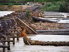 台風21号の爪痕ですが、流れ橋がこのように流れています。台風通過後4日経っていますが、木津川は怒濤のように川幅いっぱいに流れています。通常は広い川幅のホンの一部にしか川はありません。去年の4月に新しく完成した流れ橋なのに1年と7ヵ月でまた流失、元通りに再建されるか心配です。