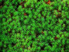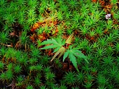 スギゴケが一面に生えているところがありました。一面のグリーン中で、ポツンと茶色の枯れ葉が一枚乗っていました。いかにも枯れ葉という感がします。緑色のモミジは同じ落ち葉でも生命感があります。