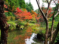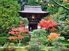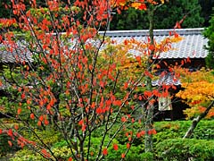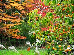 一ヶ月後の円成寺です。紅葉が見頃となっていました。楼門の前には池が広がっていて、その周囲にはモミジ等が赤くなっていました。柿も赤くなっています。赤い柿、白いススキを見るといかにも人間と自然が共存する、里山という感がします。(動 画)