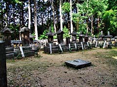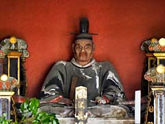 本堂内には、創健者の柳生宗矩の座像がありました。(写真左)そして、歴代の柳生家のお墓があります。(写真中央)左から「宗冬」、「宗矩」、そして剣豪で名高い「三厳(柳生十兵衛)」の墓です。(写真右)