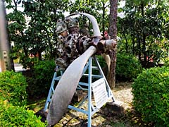 京都府八幡市に「飛行神社」です。創建者の二宮忠八は、明治24年(1891)日本で初めて動力つき模型飛行実験に成功しましたが、人を乗せる飛行機をライト兄弟が成功したことを知って、飛行機開発を断念しました。その後飛行機による事故死が多発したので、私財を投入して犠牲者の霊を祀る神社を大正4年(1915)を創建しました。零式戦闘機のプロペラが展示されていました。(写真右)昭和58年10月に大阪湾で漁師が漁網に引っ掛かり引き上げられたものとのこと。