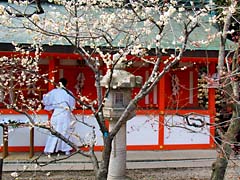 梅林を出て社殿に戻りました。梅林の梅よりも社殿と一緒に写す梅の方が、北野天満宮らしく絵になる梅を写すことができました。