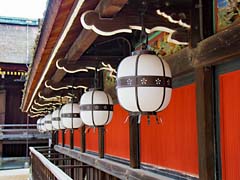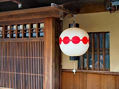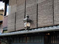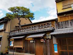 上七軒歌舞練場(写真左)です。ここで3月25日から4月7日まで「北野をどり」が行われます。御茶屋にはこのような提灯があります。(写真中央)格子出窓に提灯京都らしい風景です。御茶屋が続く街並みに盆栽の松が覗いているようなところがありました。(写真右)