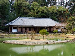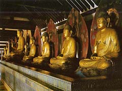このような小さな山門を潜ると浄瑠璃寺の庭園が広がっています。国宝の本堂の中には、九体の阿弥陀如来座像(国宝)があります。それ故に「九体寺」とも呼ばれています。撮影禁止となっていますので、これはパンフレットの写真を引用しました。平安時代には30数例あった九体の阿弥陀如来と阿弥陀堂は、ここが現存唯一の寺院となっています。平成29年4月から5年間にわたって順次修復されるので、1~2体の阿弥陀如来が不在になるそうです。九対揃ったのを見られて幸運でした。