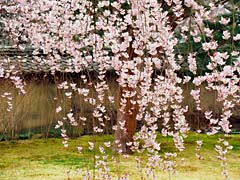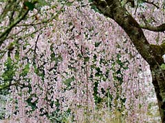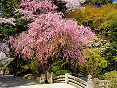 次に行ったのは、「三宝院」です。国宝の唐門で、「五七桐」と「十六菊花紋」がデザインされています。(写真左) 門を入ると「大紅しだれ」が迎えてくれます。(写真中央、右)