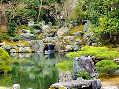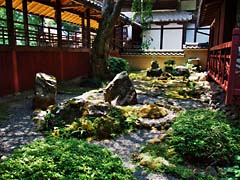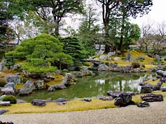 三方普感庭と呼ばれる庭園です。(動 画)三方とは、高廊下(写真中央の左側)、茶室(写真右)、御殿のことです。春には見事な花を咲かせるであろう枝垂れ桜の木があります。(写真左) 写真には写っていませんが、鹿威しもありました。(動 画)