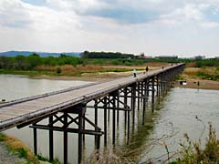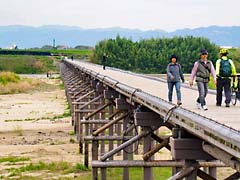 上津屋橋(流れ橋)で、上段は城陽市側、下段は八幡市側から写しました。橋が新しくなったに伴い周囲も整備されています。橋のたもとにある石仏も新しい社に変わっています。流れ橋と書かれた石標は、俳優の藤田まことが寄贈したものです。そう言えば、中村主水がこの橋を歩く場面がよくありました。自転車専用道路がありますが、利用者の休憩所が新たに整備されていました。