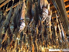 鮭を販売している「きっかわ」という店に入りました。店の中も公開していたので見てきました。鮭をこのような形でカチカチに干してあります。鮭は塩鮭が一番美味しいと私は思います。