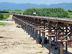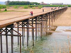 1年7ヵ月ぶりに流れ橋(上津屋橋)が完成しました。4年連続の21回流れているので今回は、橋全体を75cm高くした。流木やゴミが引っかからないように橋脚間隔を広げた。木製の橋脚を一部コンクリートにしたなどの工事を行って「流れ橋から流れにくい橋」にしたそうです。総工費は3億7千万円だそうです。