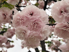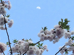 八重桜が見頃を迎えています。夕方西の空を見上げると上弦の月がありましたので八重桜と一緒に写して見ました。春ですね。