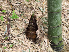 井手町は竹林が多いところです。太い竹にはタケノコが・・・・思った通り立派なタケノコが顔を出していました。ここは、タケノコを栽培している農家の竹林です。
