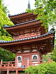 ツツジ越しに本堂の屋根が望まれます。そして三重塔とその風鐸です。この三重塔は、明治43年に兵庫県佐用町にある高蔵寺から購入したものだそうです。当時は寺院にとって重要なものでも売却する寺があったのですね。そんな悲哀の歴史を背負って新緑に映えていました。