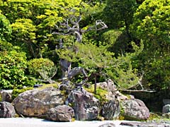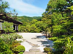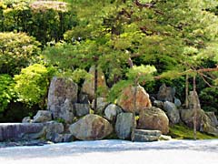 方丈前にある庭園です。「鶴亀の庭園」と呼ばれて寛永7年に小堀遠州が作った、江戸初期の代表的枯山水です。写真中央が亀島、写真右が鶴島です。(動 画)