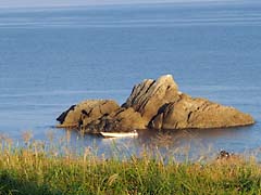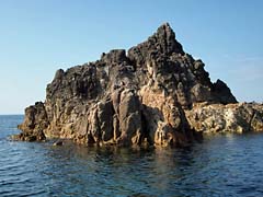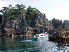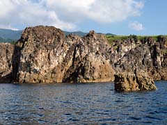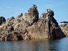 舟は海に浮かぶ岩と岩の間を縫うようにして進みます。この岩は、北アルプス穂高岳の頂上の岩によく似ています。鳥たちも羽を休めていました。