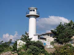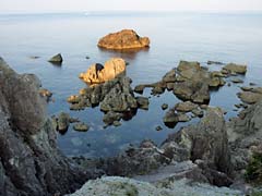 春日崎の足元は、このような絶壁になっています。遠くの小さな岩に海鳥が羽を休めていました。波音もなく静かな岬で虫の鳴き声が聞こえるだけでした。(動 画)