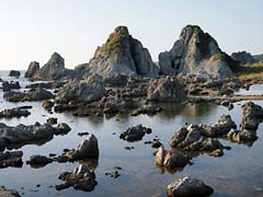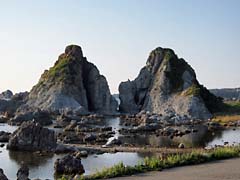 次に行ったのが、佐渡弥彦米山国定公園「七浦海岸」です。「佐渡・夫婦岩」があります。右側の岩が夫で高さ22.6m、左側の岩が妻で23.1mあります。妻の方が大きいのです。どこの世界でも女性は強いようですね。夫婦岩と言えば伊勢・二見浦の夫婦岩が有名ですが、伊勢より佐渡の方が倍以上大きい岩なのだそうです。それと伊勢のように注連縄(しめなわ)がありません。