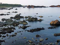 七浦海岸・春日崎の夕日です。ここから見る夕日は美しいということで知られているところだそうです。振り返ると今夜宿泊するホテルも赤く染まっていました。雲があり夕日が鮮明でないのが残念!!