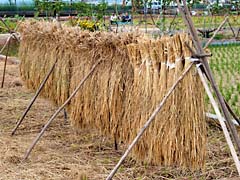 田圃には、稲木が見られます。近頃はコンバインで刈り取ってしまうのでこのような風景は少なくなりました。取り忘れられた稲穂がありました。刈り取った後から稲が芽を出して、田植えをしたような状態に成長していました。