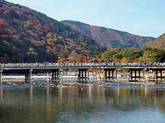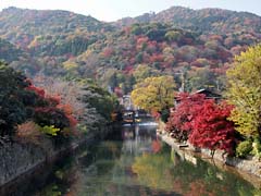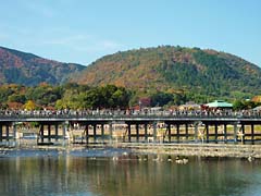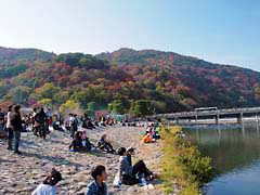 いよいよ嵐山到着です。綺麗に紅葉していました。橋の上から撮しましたが、静かな川の流れのように見えますが、撮影している橋の上は人が溢れて押すな押すなの状態になっています。
